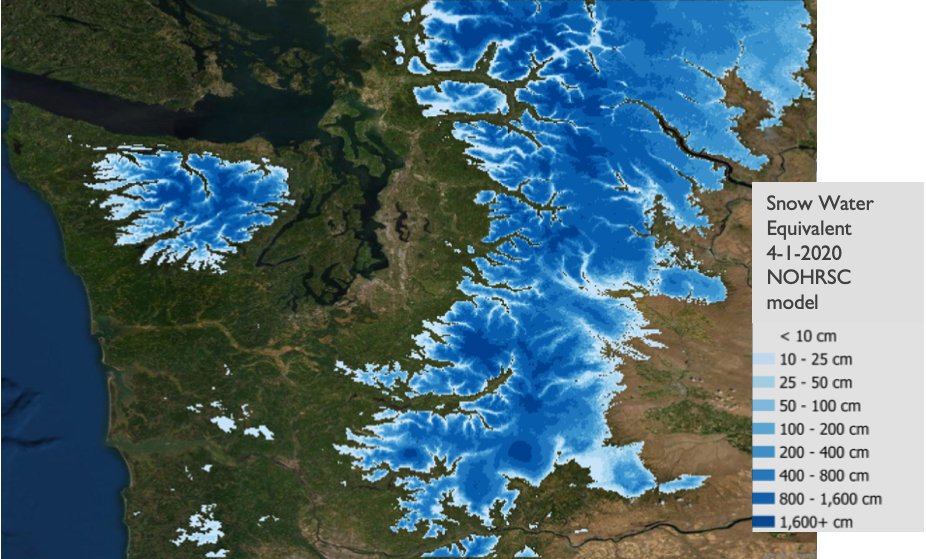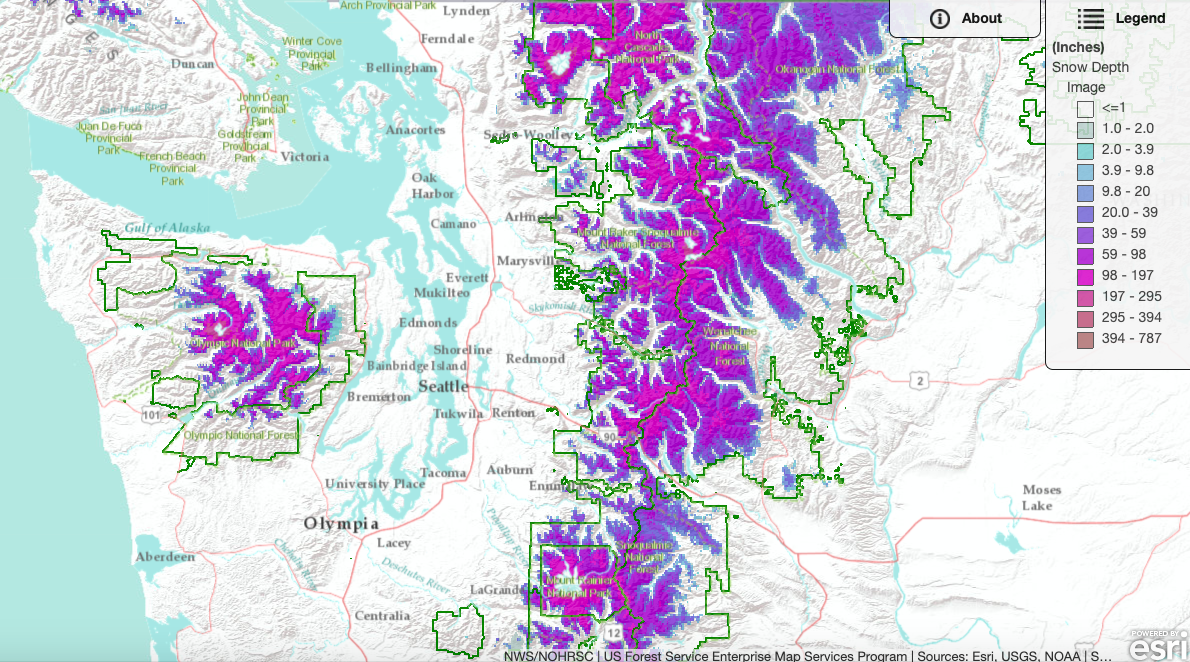 This map displays current snow depth according to the National Oceanic and Atmospheric Administration (NOAA) National Snow Analyses (NSA), which is a product of the NOHRSC. It is hosted by the USFS Pacific Southwest branch and defaults to the Sierra mountains of California, however the map shows the entire Western United States including Washington state. It is an effective visualization of the NOHRSC data described above.