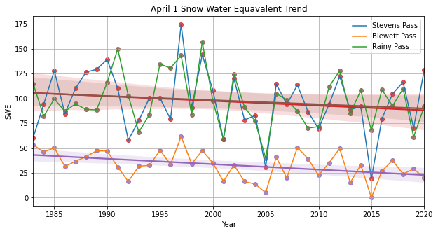 Snow Water Equivalent (SWE) from SNOTEL for end of season snowpack (April 1) at Stevens, Blewett, and Rainy Pass 1983-2020. Three notable mountain passes within the range are selected. Their yearly end of season measure of the water contained in the snowpack is plotted. A linear regression shows trend decreases in snow water equivilent over the 37 year period.