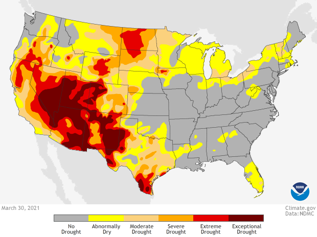 Credit National Oceanic and Atmospheric Administration (NOAA). Draught status for the United States at the end of Winter season in 2021. Washington remains relatively unaffected this year in part due to a healthy La Nina snowpack, however much of the Western United States is currently in a draught. During low snow years this outlook will become increasingly dangerous. Water shortage and wildfire hazard are major implications of draught, contributed to by diminished snowpack.