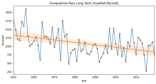 Longterm snowfall totals at Snoqualmie Pass. This data is sourced from the Washington State Department of Transportation and displays a long term record of how much snow is falling at Snoqualmie Pass, located just over 3000 feet above sea level. Interannual variation can be observed both on uncharacteristically dry and snowy years. A linear regression shows comprehensive decreases in snowfall at this area.