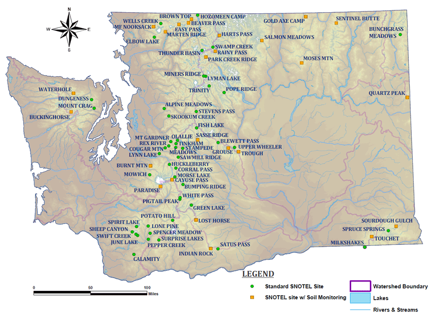 The Natural Resources Conservation Service (NRCS) maintains the Snowpack Telemetry (SNOTEL) network. These stations provide weather and snow data updated hourly stretching back decades. Different stations record different information, but almost all sites measure snow water equivilent (SWE), snow depth, precipitation, and temperature. There are 82 sites in Washington state. Data can be accessed with various methods: