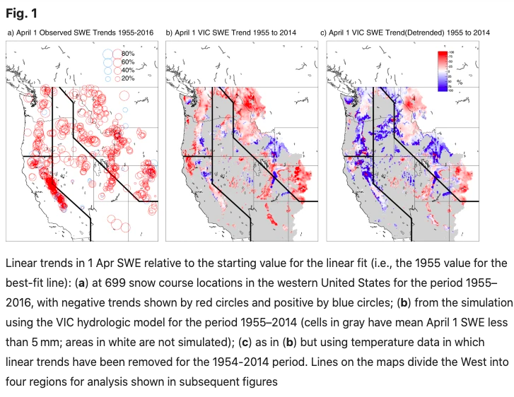 Mote et al. 2018. An examination of dramatic decline of snowpack in the Western US. Trends in SNOTEL SWE, and VIC, a hydrological model, are displayed shown across the nation over a long-term time scale. Comprehensive decreases in snowpack can be plainly observed.