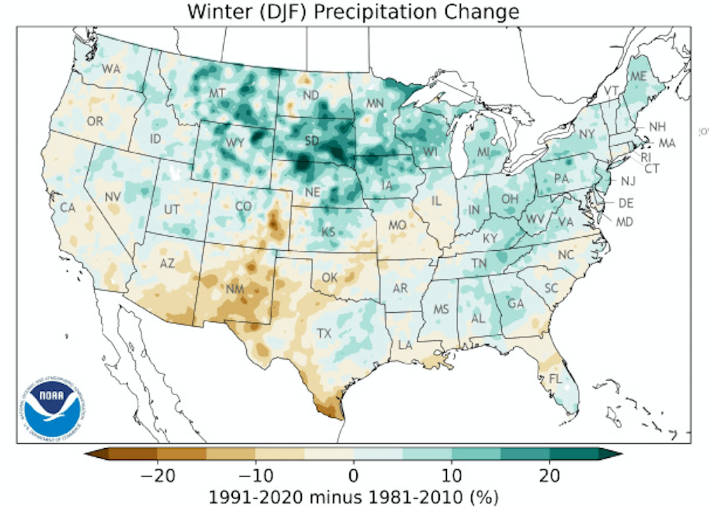 Credit National Oceanic and Atmospheric Administration (NOAA). Longterm changes in Winter precipitation show can greatly affect snowpack in different areas. Volaitle changes as a result of climate change creates an unpredictable outlook for snow falling as precipitation in the long term. Washington has a split outlook on Winter precipitation change, and will likely experience highly variable climate patterns in the coming years.