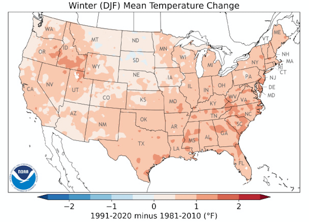 Credit National Oceanic and Atmospheric Administration (NOAA). Longterm changes in mean temperature show a warming across the United States, and undeniable evidence of warming in the Winter season. This map represents the latest "climate normal" which is utilized by NOAA, and shows how these normals are rapidly changing.