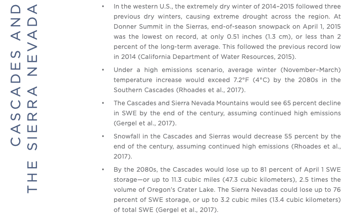 Hagestad, Protect Our Winters, 2018. Summary of end of century predicted snowpack impacts for both the Cascades and the Sierra Nevada. A frightening and massive decrease in snowpack predicted by one of the most influential orgnizations in the field, Protect Our Winters. POW is a nonprofit that focuses its efforts on legislation regarding climate change.