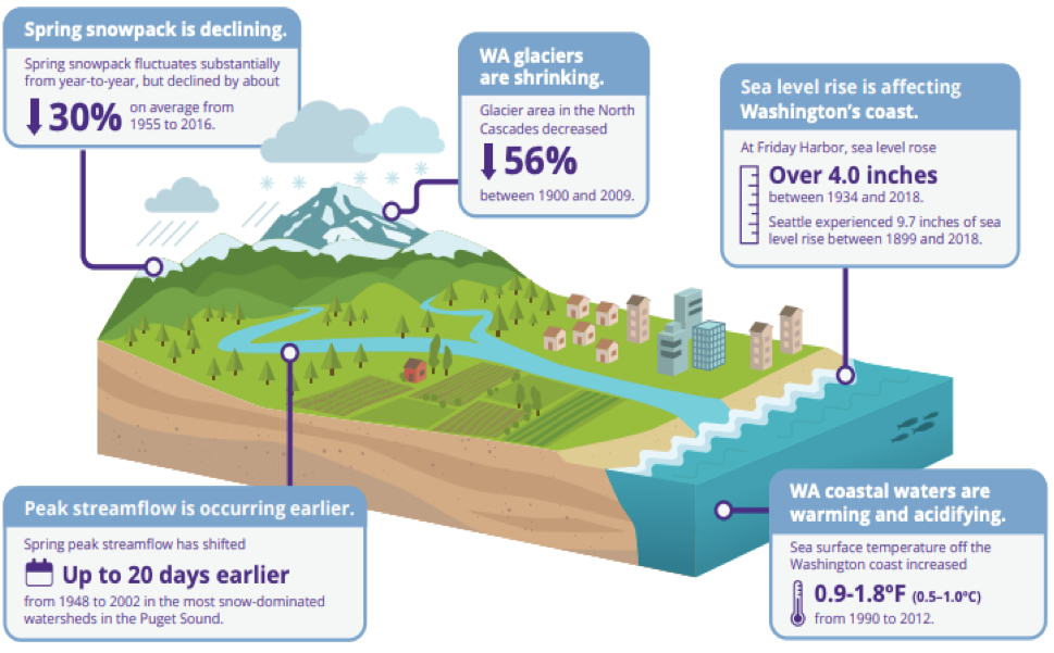 Roop et. al. 2020. An effective visualization of the observed hydrological impacts of climate change for Washington state. The University of Washington Climate Impacts Group prepared this in their descriptions of the implications for Washington state from the The Intergovernmental Panel on Climate Change’s Special Report on the Ocean and Cryosphere. These changes specific to the region are not merely predicted or hypothetical-- they are ongoing proccesses with discernable impacts.