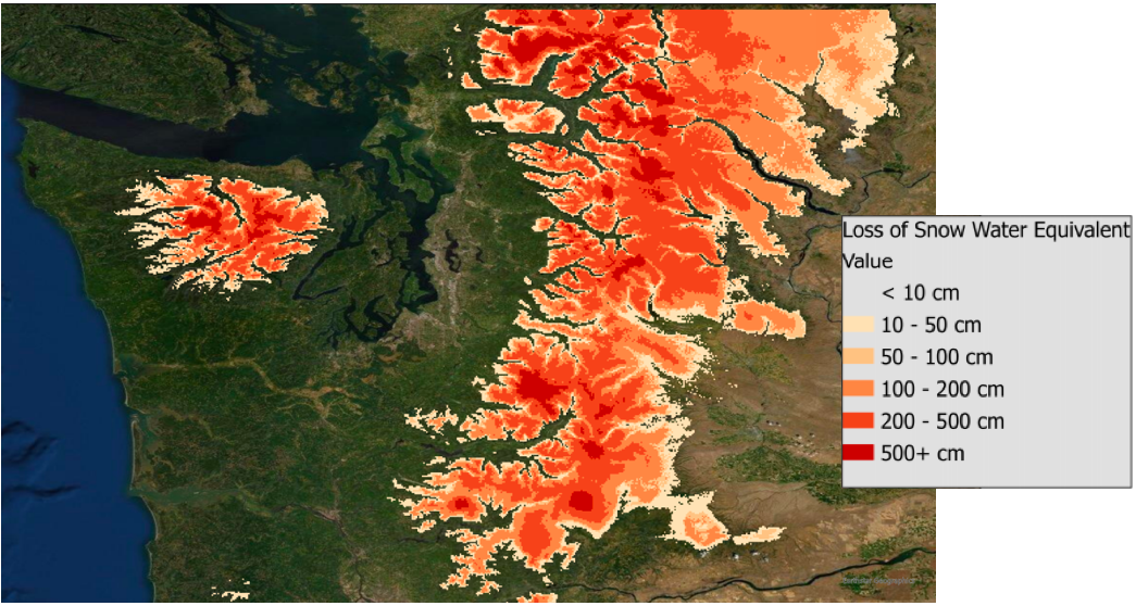 Estimated Snow Water Equivalent (SWE) loss from 2020-2050. This map shows an estimate of the amount of water in the snowpack which will no longer be present during a 30 year period. It is created using Raster manipulation of 2020 NOHRSC data, applying a 40% decrease in SWE.